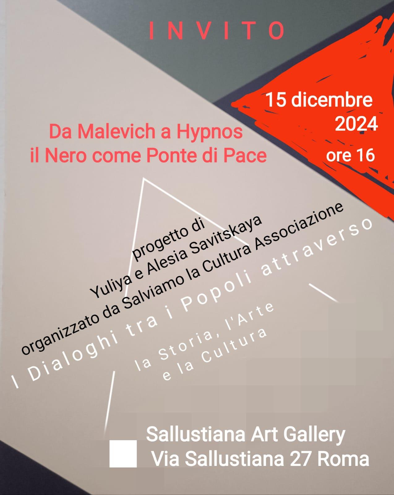 Lo trasforma, lo evolve, lo rende un’entità vivente. Il Rettangolo nero, di Hypnos, è, infatti un’opera intrisa di potenza ancestrale e tecnologica, una fusione tra passato, presente e futuro. Realizzata con la shungite un minerale russo, noto come terra viva, l’opera è dinamizzata da un atto sciamanico senza precedenti: Hypnos, infatti, ha infuso il suo stesso sangue nel dipinto, trasferendovi dunque il suo genoma. Con questo gesto, il Rettangolo nero, non solo “espande” il Quadrato di Malevic, ma diventa anche un simbolo di immortalità, un’opera che respira e vibra, capace di interagire con il mondo in modo attivo. Se il nero in Malevic, era la vittoria sulla natura passiva, in Hypnos, diventa il portale verso una nuova dimensione rappresentando appieno il passaggio da un millennio all’altro. La shungite, inoltre, con la sua capacità di assorbire radiazioni e di rigenerare l’energia, rende l’opera un vero e proprio catalizzatore spirituale. Ma è il sangue di Hypnos, contenitore del suo DNA, a fare di quest’opera un vero e proprio totem vivente, capace di unire materia, spirito ed energia in un unico fulcro simbolico. Il gesto artistico di Hypnos, quindi, espande non solo il Quadrato nero di Malevic, ma il concetto stesso di arte coniugandolo direi quasi fondendolo, col mondo alchemico e rituale. Con la fusione del minerale e del sangue, l’opera supera, infatti, il concetto di arte come oggetto statico: diventa energia pura, incarnazione dell’immortalità dell’artista e della memoria collettiva. Questo Rettangolo nero, non è più un riflesso del passato, come lo era il Quadrato di Malevic, attraverso l’elaborazione mentale di quel grande artista e pensatore, ma è diventato un pensiero vivente, un’entità autonoma che si proietta nel futuro. Hypnos riprende il nero, tradizionalmente associato all’antimateria, all’assenza di vita, al lutto, al mistero ed alla morte e lo trasforma nel colore della rigenerazione e dell’eternità, quasi un messaggio di speranza nella resurrezione Cristica, in un momento buio della storia dell’umanità, come quello che stiamo vivendo. Se il Quadrato nero di Malevic, rappresentava la nascita di una nuova spiritualità, il Rettangolo nero di Hypnos è un richiamo alla vita stessa, un simbolo di pace, resistenza e rigenerazione. È un’opera che sfida le leggi del tempo, proponendo una nuova alleanza tra l’umano e il cosmico. Con questo atto straordinario quindi Hypnos, ci invita a riflettere sul potenziale infinito dell’arte, che non è solo un linguaggio, ma una forza capace di creare connessioni e trasformazioni, ma soprattutto, di affermare la realtà del concetto di immortalità spirituale, unica vera alternativa, alla mera sopravvivenza fisica, per la quale spesso l’essere umano perde se stesso, svendendo la propria essenza metafisica. Ecco perchè l’evento che si svolgerà domani, domenica 15 Dicembre, alle ore 16 presso la Sallustiana Art Gallery, di Roma, in Via Sallustiana 27 si preannuncia come straordinario mettendo insieme la memoria storica del Quadrato di Malevic attraverso la narrazione della vita di quel grande artista bielorusso, fatta da un suo discendente e l’esposizione di due Rettangoli neri di Hypnos, donatimi a suo tempo dall’artista e da me lasciati a disposizione per l’evento, per cercare di costruire, attraverso l’arte e la cultura che da essa deriva, un ponte di dialogo tra est ed ovest e di pace fra i popoli, in un momento in cui pare dominare la scena, la logica delle armi e della guerra.